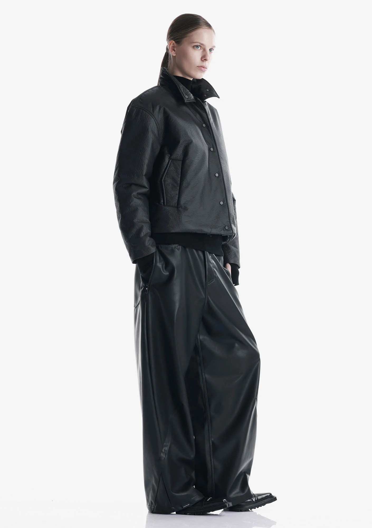 THETA padded jacket is made from nylon with a cire finish—smooth, leather-like, soft to the touch, and water-resistant. The interior is lined with fleece for added warmth and comfort. The recycled polyester insulation provides warmth without bulk and retains its shape. A snap-button stand collar, pockets, elastic cuffs, and adjustable hem offer wind protection and a comfortable fit.